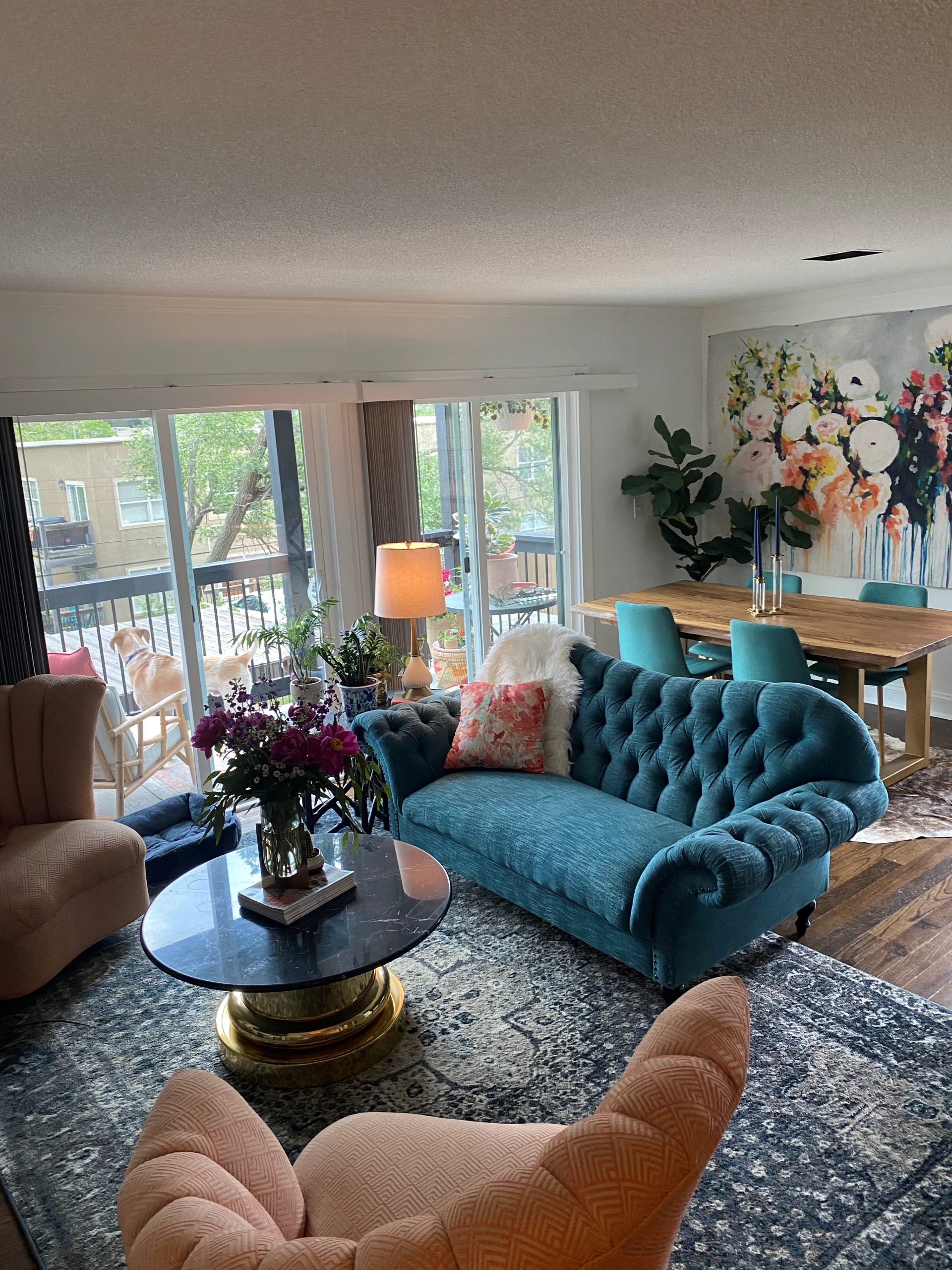 Plaza Patio is a 14-unit community featuring studios, one-bedroom apartments, and a single two-bedroom, two-bath home. First-floor units offer walk-out patios, while upper-level units include balconies. Some homes feature exposed brick walls for added character.